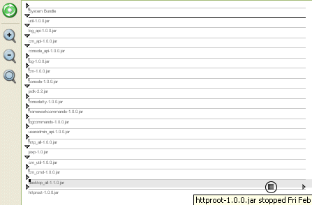 The center bundle view area display all installed bundles and their states. By clicking on bundles in this are, detail information is displayed in the Bundle detail area Four different views a supported internally (new can be installed):