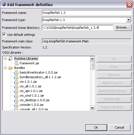 You can override the default settings by unchecking 'Use default settings'. This will allow you to change the main class, the runtime libraries and the bundles. For instance if you have embedded the framework into a launcher you will want to add the launcher libraries to the runtime libraries and also change the main class which is invoked on launch. Or maybe you want to add or remove some bundles from the framework. The bundles listed here can later be used through bundle repositories when building and running bundle projects. All user defined changes that are made are shown in bold text in the list.