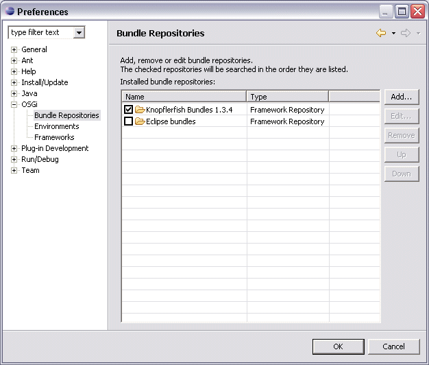 Bundle repositories are used when searching for bundles. The plug-in searches for bundles to find packages available for import by bundle projects, to find bundles to add to a bundle projects build path and to find bundles to add to launch configurations. In order to have any bundles available you need to set up at least one repository. The repositories are searched in the order they are listed. Only repositories which are checked, i.e. marked as active, are searched.