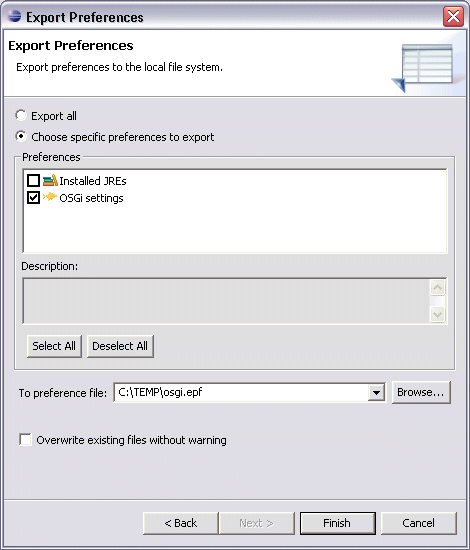 You can export the OSGi preferences by selecting 'File->Export...'. In the dialog shown you select 'Preferences'. A new dialog will be shown where you specify which preferences to export. Here you can select 'OSGi settings', which will include all OSGi preferences made. The preferences are exported to a file. The file can be used to share preferences in a team or, if you have created a new workspace you can use it to avoid setting up all the preferences again.